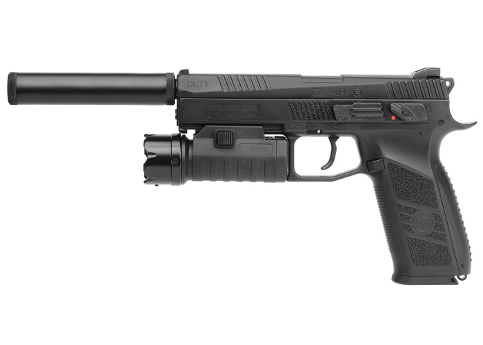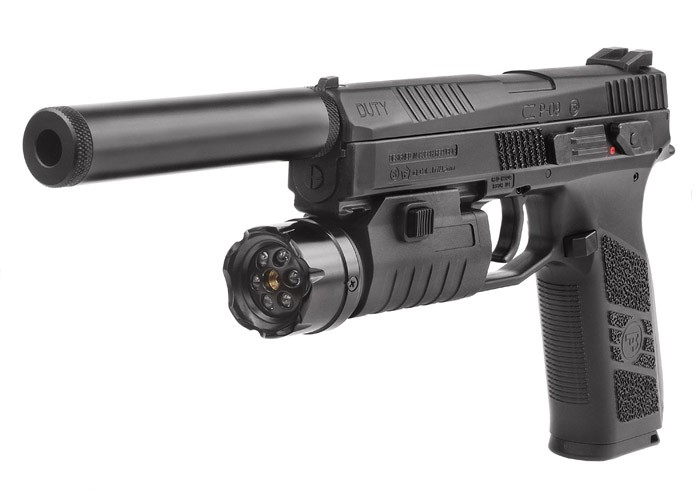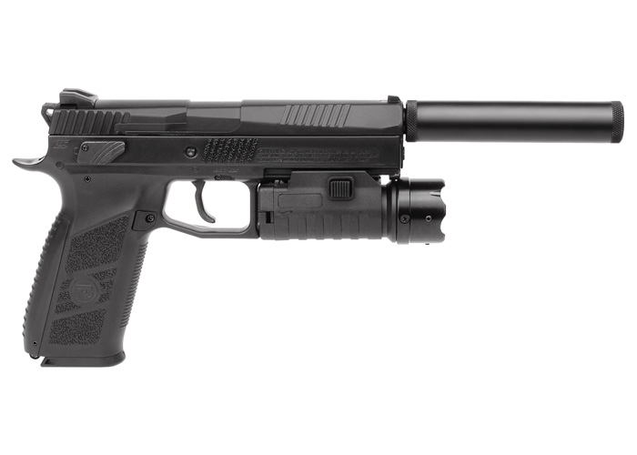 CO2 (12-gram cartridge) Semiauto 18-rd BB magazine Double-/single-action Blowback Fixed front sight Fully adjustable rear sight Metal construction One of the most accurate BB guns we sell! Includes X-mount Weaver rail, compensator and steel BBs